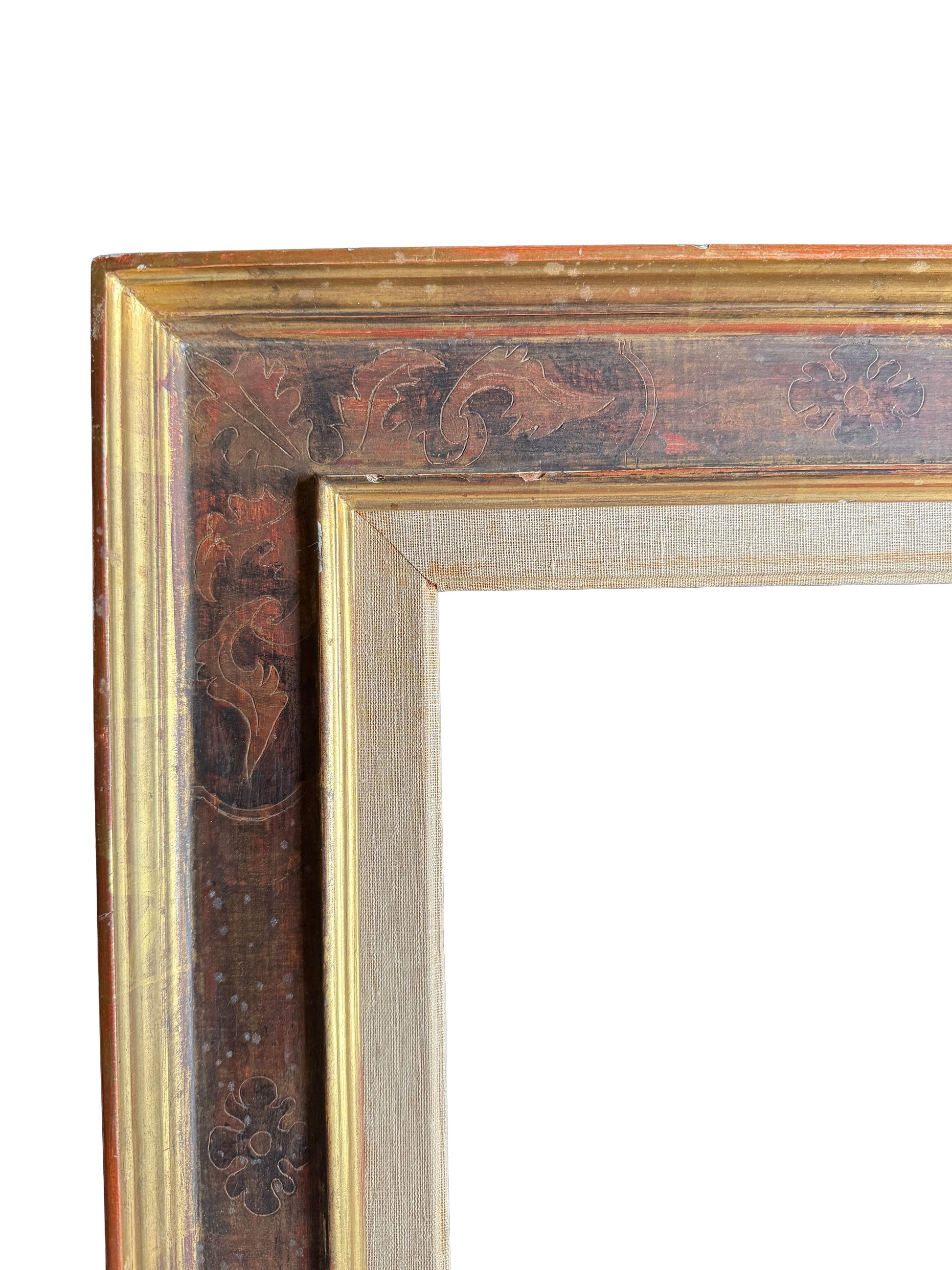 A painted Casetta frame with gilt inner and outer edges and a linen slip